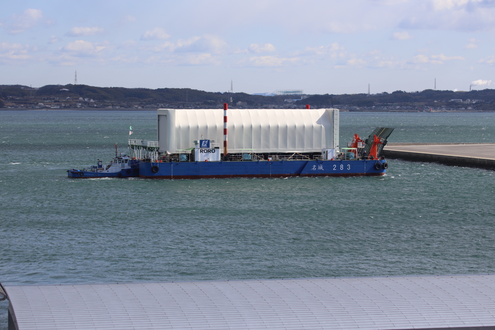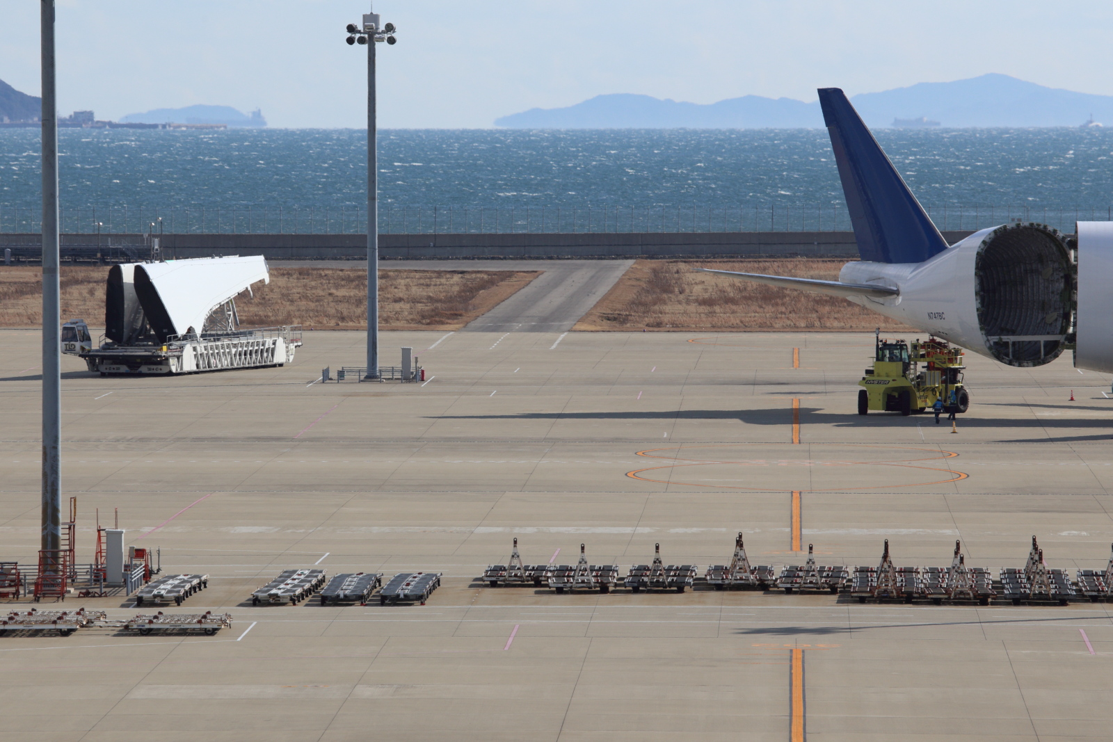 11時少し前。沖を荷物を積んだ台船をタグボートが引っ張ってきました。大きさから見てB787の主翼と思われます。港から撮影してみました。主翼を積んだ輸送車。すぐ近くの作業員と比べると、その大きさがわかります。この輸送車。車輪がいっぱい付いていて、運転席が見あたりませんが自走します。ラジコンで操縦しているのでしょうか??