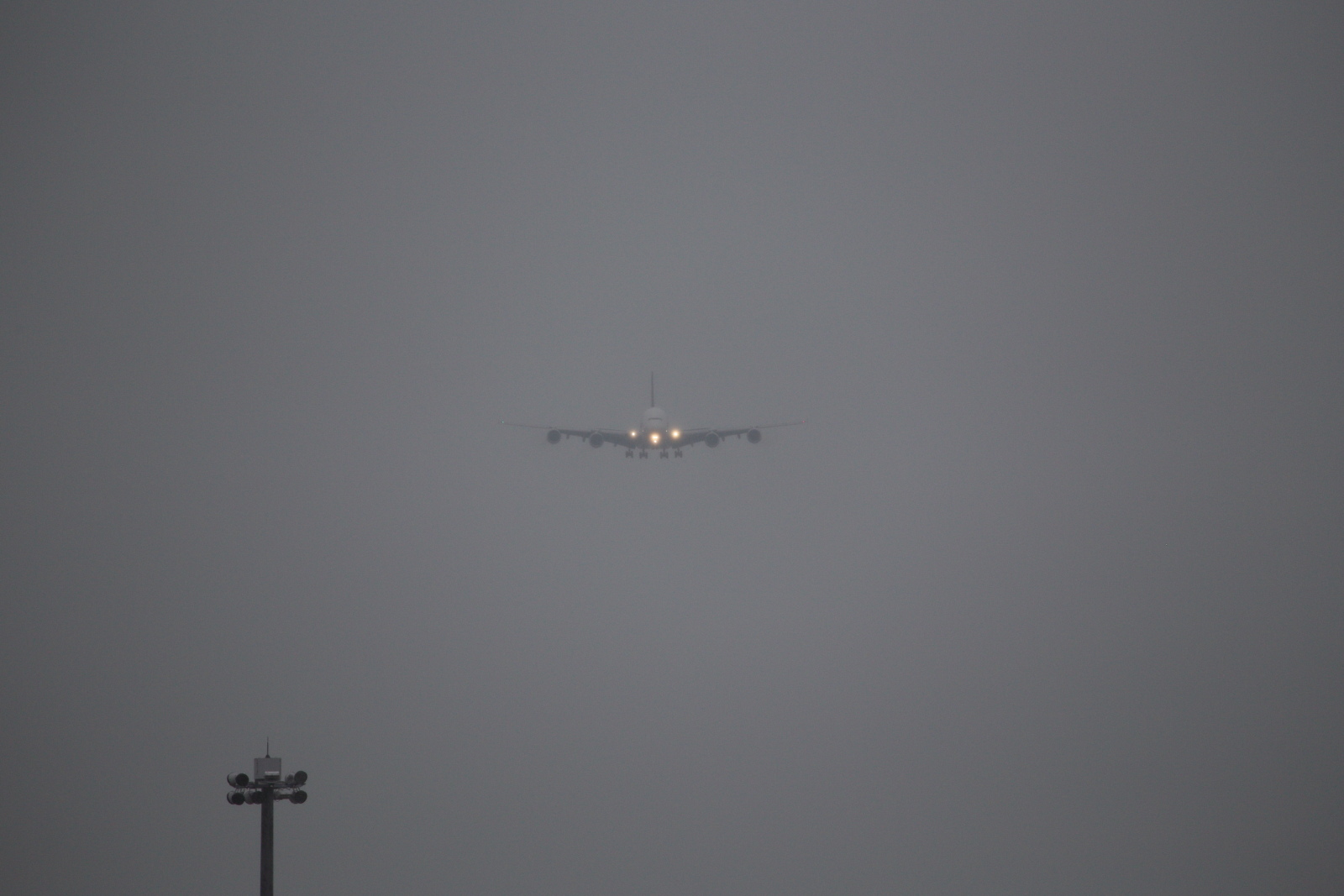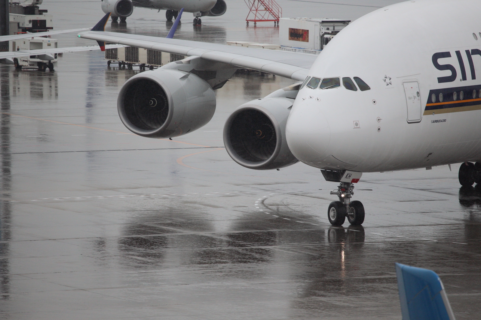 8月9日(土)。中部国際空港にシンガポール航空のエアバスA380がやって来ました。シンガポール航空が名古屋に就航して25周年を記念して、この日と8月13日の2日間、いつものA330に変えての運航です。台風が接近する中、雨が降っていたのですが、デッキは超満員。消防車2台で歓迎の放水も行われました。