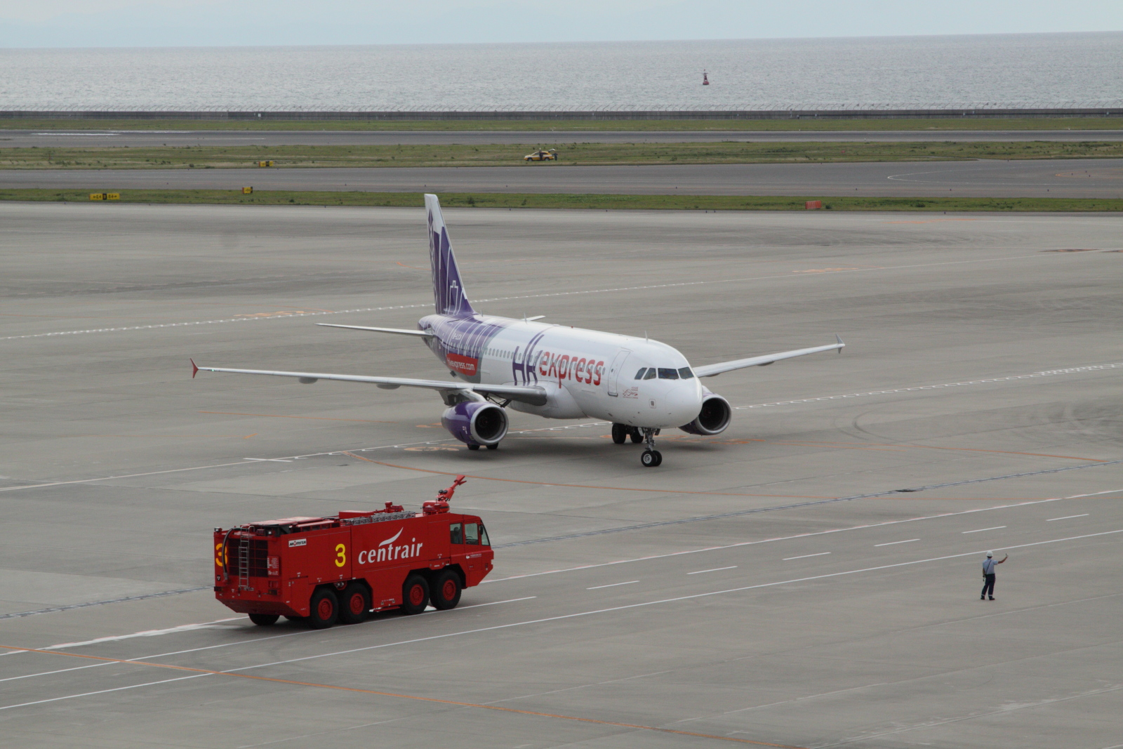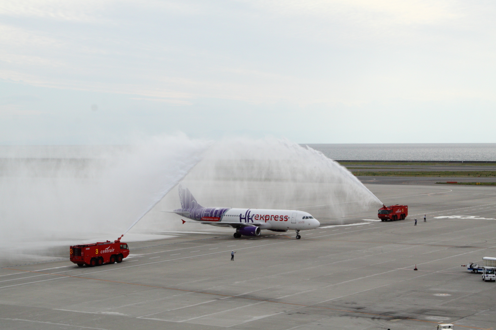 今月は、ホンコンエクスプレスが新規就航しました。4階イベントプラザで記念式典が行われ、到着した第1便は消防車から歓迎の放水を受けました。
