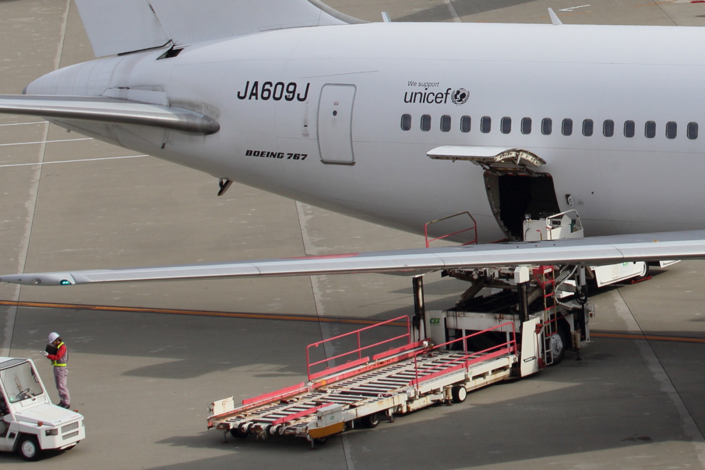 お昼前、空港南の787部品倉庫から、部品を積んだローダーが出てきました。 |