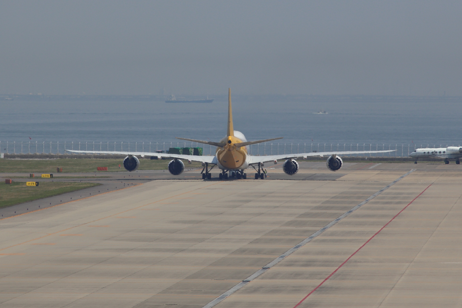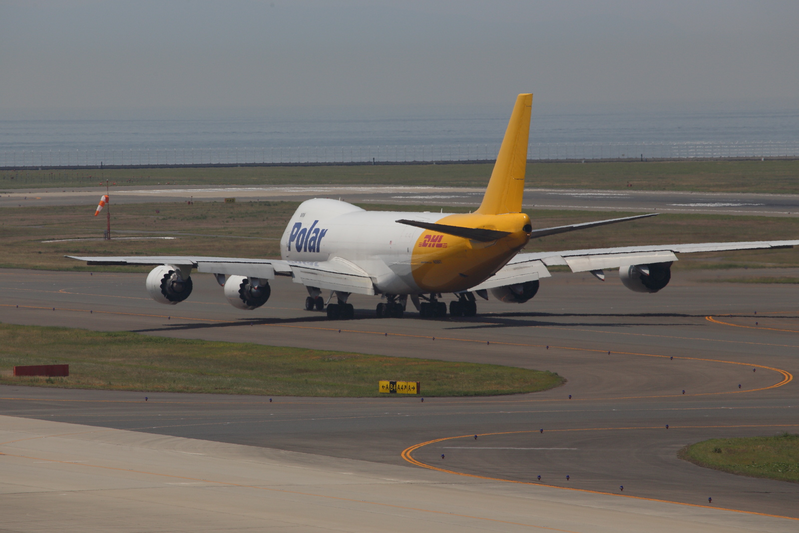 8時少し過ぎに南の空に4発エンジンの機体が見えてきました。LCFかと思っていましたが、尾翼が黄色。機体にPolarの文字が書かれていました。この機体、よく見ると、ボーイング787のように、主翼端が後退しているレイクドウィングチッブですし、エンジンカバーの出口側がギザギザになっているシェブロンノズルになっています。747の最新型の貨物機です。