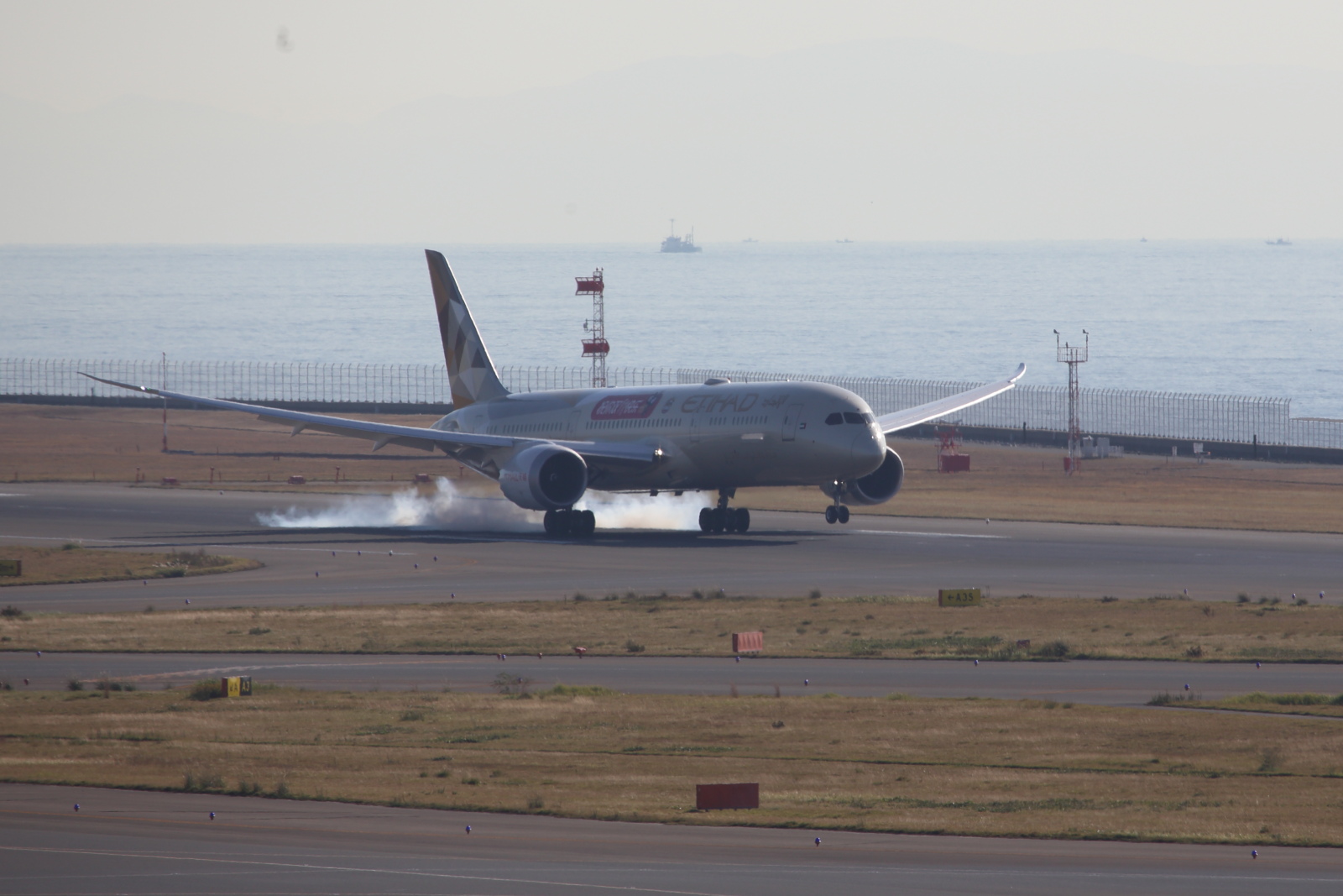 もう一機。エティハド航空の787ですが、機体とエンジンカウルに特別塗装がされています。何を意味しているかわからなかったので、調べてみました。